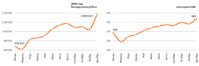 Динамика изменения средней зарплаты в 2009 г. в белорусских рублях и долларах США