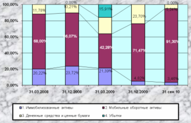 Индекс постоянного актива показывает долю основных средств и внеоборотных активов в источниках собственных средств. В нашем случае, происходит одновременное снижение коэффициента маневренности собственного капитала и рост индекса постоянного актива, что является следствием увеличения доли внеоборотных активов в сумме собственного капитала предприятия. В результате этого значительно снизилась мобильность собственных источников средств.