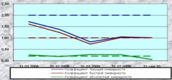 Как видно из графика коэффициентов ликвидности, в деятельности предприятия не наблюдается достаточная стабильность, которая позволяет сделать вывод о рациональности использования денежных средств и отсутствии риска утраты платежеспособности.