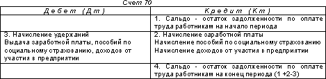 На суммы произведенных начислений заработной платы, пособий по социальному страхованию, доходов от участия в предприятии увеличивается задолженность предприятия перед работниками по оплате труда, которая отражается по кредиту счета 70 «Расчеты с персоналом по оплате труда».