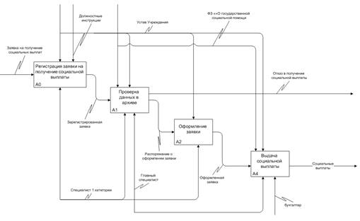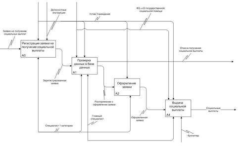 Так как одним из основных видов деятельности ГУ УСПН Балаковского района является осуществление назначения социальных выплат и предоставления мер социальной поддержки отдельным категориям граждан, осуществление мер по социальной поддержке семьи, женщин и детей, проведение мониторинга в сфере социальной поддержки населения и подготовка на его основе информации для Министерства и территориальных органов Министерства, оказание консультаций по правовым вопросам, относящихся к компетенции Учреждения то целесообразно рассмотреть данную функцию методом функционального анализа и моделирования IDEF0. С помощью наглядного графического языка IDEF0 изучаемая система представляется в виде набора взаимосвязанных функций, которые в терминах IDEF0 называются функциональными блоками.