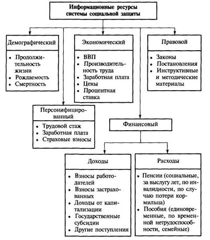 Обобщенная структура информационных ресурсов систем социальной защиты. Ресурсы для финансирования пенсионных систем не должны рассматриваться в изоляции от процессов, посредством которых достигается и поддерживается экономический рост. Это говорит о том, что для проведения полного системного анализа ситуации в области социальной защиты (в том числе и пенсионного), необходимо учитывать все информационные ресурсы как данной сферы, так и многих других сфер жизнедеятельности государства.