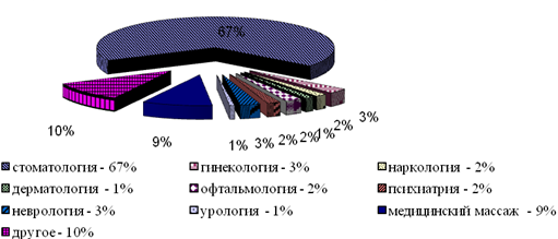 Лідером малого бізнесу в охороні здоров'я є стоматологія, причому це характерно як для малих підприємств, так і для індивідуальних підприємців. Близько 39 відсотків малих підприємств спеціалізуються на стоматології, далі з великим відривом слідують офтальмологія (12,4%), медичний масаж (11,2%) і гінекологія (9,6%). Крім того, більше 36 відсотків малих підприємств є багатопрофільними і при виборі основної спеціалізації не могли себе однозначно ідентифікувати, у зв'язку з чим, враховані в графі «інше».