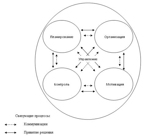 Функции управления – обособленные направления управленческой деятельности. Таким образом, процесс управления – взаимосвязь функций планирования, организации, мотивации и контроля, которые объединены связующими процессами коммуникации и принятия решения.
