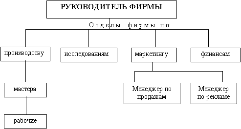 Во главе каждого отдела (маркетинга, коммерции, бухгалтерии, экономики и анализа и т.д.) находится руководитель, наделенный всеми полномочиями и осуществляющий единоличное руководство подчиненными ему работниками, сосредоточивающий в своих руках все функции управления. Сам руководитель находится в непосредственном подчинении руководителя высшего уровня [См. Приложение А].