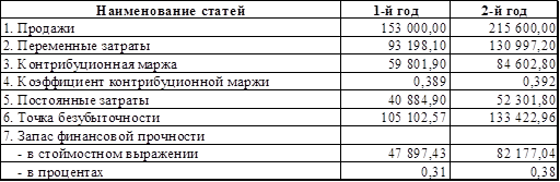 На основании данных вычислений можно сказать, что контрибуционная маржа за первый год составила 59 801,9 тыс. долл., что превышает постоянные расходы за данный период на 18 917 тыс. долл., тем самым свидетельствует о достаточности их покрытия и способности предприятия получать прибыль. Во втором году контрибуционная маржа составила 84 602,8 тыс. долл., то есть также превышает постоянные затраты на 32 301 тыс. долл., соответственно покрывает постоянные затраты за данный период и предоставляет предприятию прибыль.