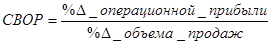 Действие операционного рычага проявляется в том, что любое изменение выручки от реализации всегда порождает более сильное изменение прибыли. Проанализируем изменение операционной прибыли за счет изменения продаж. Для этого необходимо рассчитать силу воздействия операционного рычага:
