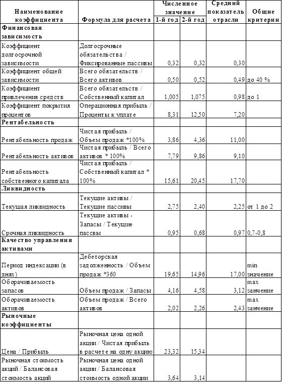 Коэффициентный анализ показал, что предприятие на 50 % зависимо от заемных средств, и зависимость эта растет, что может привести к определенным трудностям. При этом все показатели зависимости превышают общеотраслевой уровень. На данный момент рентабельности предприятия характеризуется положительно, тем самым обеспечивает защищенность интересов кредиторов и инвесторов, предприятие может погашать долги и иметь прибыль. Также положительно характеризует деятельность предприятия ускорения оборачиваемости, как всех активов, так и дебиторской задолженности и запасов в частности. Оборачиваемость активов конечно ниже общеотраслевого уровня, но все же ускорение использования активов свидетельствует о высвобождении средств, а также о положительном финансовом результате. При этом рыночные показатели говорят о снижении инвестиционных характеристик и перспектив предприятия. Но, не смотря на это, на основании анализа вероятности наступления банкротства можно сказать, что предприятие имеет благополучное положение. Предприятие имеет эффективную операционную деятельность, которую стремится расширять, тем самым повышать прибыльность предприятия. Операционный анализ показал, что операционная прибыль позволяет покрывать все расходы и получать прибыль, а также имеет тенденцию роста. Но при этом рост порога рентабельности показывает снижение вероятности получения прибыли. Развитие операционной деятельности напрямую связано со значительной долей и ростом заемных средств, что характеризует снижение всех показателей стабильности предприятия, и это в дальнейшем может сказаться на финансовом положении предприятия. Поэтому предприятию следует сократить заемные средства и обеспечивать укрепление собственной капитальной базы. Это позволит также увеличить ликвидность предприятия и эффективность его деятельности, а также снизить все возможные риски, в частности предпринимательский и финансовый, которые в настоящее время оказывают значительное влияние.
