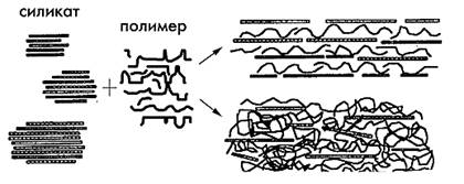Их тоже создают на основе керамики и полимеров, но с использованием природных слоистых неорганических структур, таких как монтмориллонит или вермикулит, которые встречаются, например, в глинах. Слой монтмориллонита толщиной ~1нм в ходе реакции ионного обмена насыщают мономерным предшественником с активной концевой группой (e-капролактамом, бутадиеном, акрилонитрилом или эпоксидной смолой), а затем проводят полимеризацию.