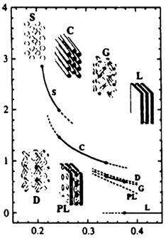 | Надмолекулярные структуры, образующиеся в нанокомпозиционном материале при разном содержании блоков. Сплошными линиями обозначены стабильные состояния: L — ламеллярная фаза, G — гироидная, С — колончатая, S — кубическая; штриховыми — метастабильные: PL — перфорированная ламеллярная, D — двойная алмазная (Matsen M.W., Bates. 1996). Кривизна поверхности – это средняя величина для всех граней наночастиц каждой структуры.