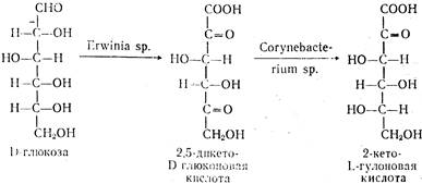 Значительные успехи были достигнуты в получении 2-кето--L-гулоновой кислоты через 2,5"дикето-0-глюконовую кислоту. 2,5-дикето-0-глюконовая кислота может быть получена при окислении глюкозы бактериями рода Gluconobactcr Егwinia. Трансформация полученной кислоты в 2-кето-Ь-гулоно-вую кислоту осуществляется многими бактериями, принадлежащими к родам Corynebacterium, Brevibacterium и др.