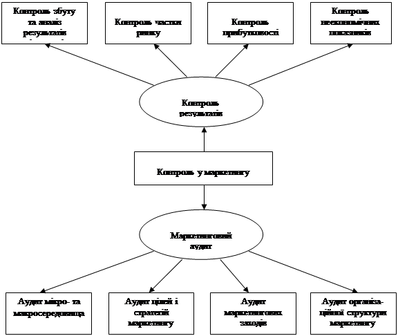 Контроль як одна з функцій управління завершує процес маркетингової діяльності. Контроль покликаний час під часу вносити корективи до виробленої стратегії. Первісними є система цілей і програма щодо їх здійснення з визначенням службових осіб, які несуть відповідальність за своєчасне і якісне виконання поставлених завдань.