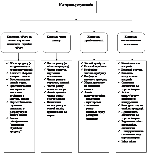 Контроль результатів передбачає аналіз збуту, частки ринку, прибутковості та неекономічних показників - кількості нових клієнтів, втрачених покупців, незадоволених споживачів, їхньої прихильності до торгової марки, поінформованості щодо торгової марки, іміджу фірми та інше.