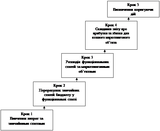 Аналіз маркетингової прибутковості дає змогу отримати відповіді на запитання, які саме маркетингові об’єкти є джерелом коштів і, що не менш важливо, де саме фірма втрачає кошти. Аналіз прибутковості проводиться за такими окремими маркетинговими об’єктами: товари, території, споживачі, сегменти ринку, канали збуту обсяги замовлень. Методика аналізу маркетингової прибутковості включає п’ять послідовних кроків (рис.4).