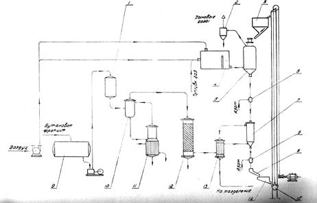 Регенерация катализатора в контактных аппаратах производится паром, регенерациопные газы выпускаются из системы (коммуникация, необходимая для регенерации, на схеме не показана).