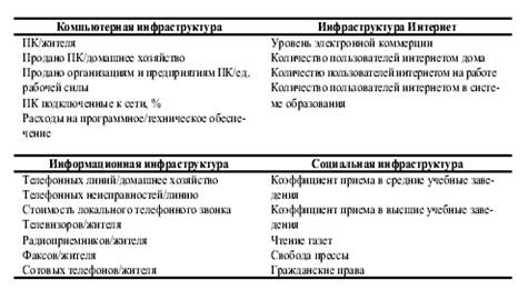 По нашему глубокому утверждению, именно сетевая экономика предоставляет возможность странам, в особенности, странам с переходной экономикой улучшить свое положение в глобализирующемся мире. И здесь нельзя не отметить такой важный фактор, как уровень информатизации общества, который является важнейшим показателем конкурентоспособности в современной глобальной экономике. Существует несколько возможностей измерения уровня участия стран в сетевой экономике. Одним из способов сравнения стран по уровню информатизации является составление индексов участия в сетевой экономике. Большой популярностью в мире пользуется сводный интеллектуальный портал Всемирного банка [2], позволяющий в интерактивном режиме анализировать и сравнивать экономики 100 стран по любой выборке из показателей, имеющихся в базе данных. Также, например, был выведен «Индекс Информатизации Общества» (InformationalSosietyIndex, ISI), который начиная с 1996 года рассчитывают и публикуют совместно две организации WorldTimes и IDC (Корпорация международных данных). Показатели агрегируют в четыре фактора (таблица 1) .