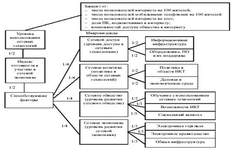 Фактически, NRI составлен на основе расчета трех разных индексов: 1) наличие сетевой инфраструктуры; 2) готовность к ее использованию в гражданском обществе, деловой среде и государственных структурах; 3) реальный уровень использования ИКТ [6]. При расчете всех трех индексов учитывается большое количество реальных индикаторов. Фактически индекс представляет собой оценку способностей страны использовать возможности ИКТ, это можно увидеть по схеме составляющих NRI (рис. 1).
