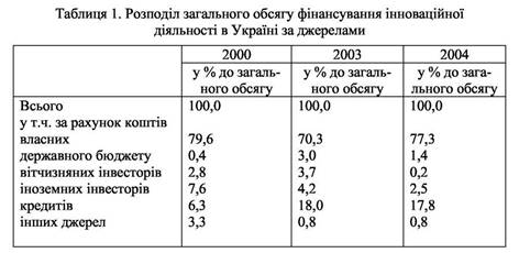 Статистичний аналіз свідчить, що у 2004 році основним джерелом фінансування технологічних інновацій були власні кошти підприємств, частка яких у загальному обсязі фінансування інноваційних робіт становила 77,3% (5).