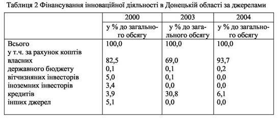 Аналогічна ситуація, пов'язана з збільшенням обсягів фінансування на інноваційний розвиток, з змінами її структури, склалася і в окремих регіонах України (6), в т.ч. і в Донецькій області (Таблиця 2).