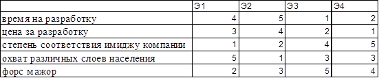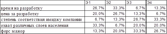 Также включим в список рассматриваемых вариант интернет рекламы и рекламы в метро (3) как наиболее сопоставимый с максимальными результатами. Имена экспертов заменены номерами дабы не создавать предвзятого отношения к мнению кого-то из них.