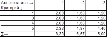 Далее проводим суммирование по вертикали, т.е. определяем какая же альтернатива наиболее хорошо оценена экспертами.
