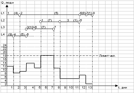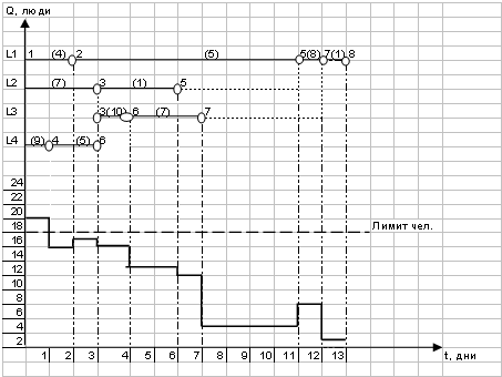Как мы видим на путях L2,L3 и L4 имеем резервы соответственно 5 и 6 дней. Следовательно их мы и сможем использовать для покрытия превышения в 2 человека.