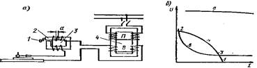 Кривая б вольтамперной характеристики источника питания дважды пересекает кривую вольтамперной характеристики дуги; точка 2 характеризует параметры тока при возбуждении дуги, точка 3 – параметры ее устойчивого горения.