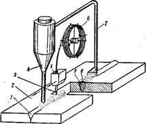 Сущность способа автоматической дуговой сварки под флюсом состоит в следующем. Сварочная головка 5 (рис. 7