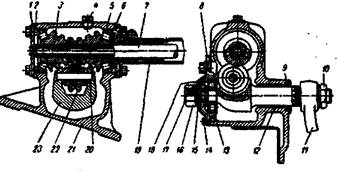 Усередині картера знаходиться робоча пара механізмів, що складає з черв'яка 3 і двухгребневого ролики 22, що знаходиться в зачепленні з черв'яком.