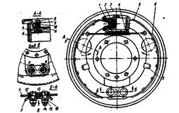Верхня частина колодок стягнута пружиною 4, що притискає верхні частини ребер колодок до поршнів циліндра, а обід колодки — до регулювальних ексцентриків.