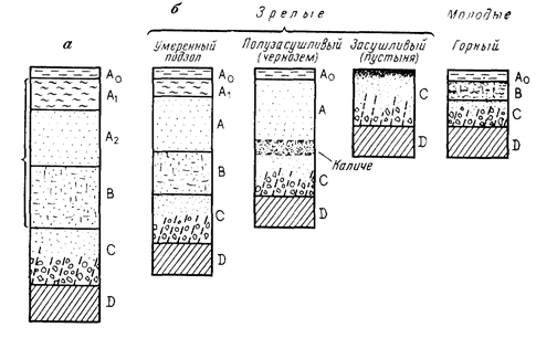 Рис. 1. Схематическое изображение почвенных профилей. а — характерные почвенные профили; б — климатические вариации. Ао—В — почва, образованная механическими, химическими и органическими процессами: Ао — частично разложившиеся органические остатки; А1