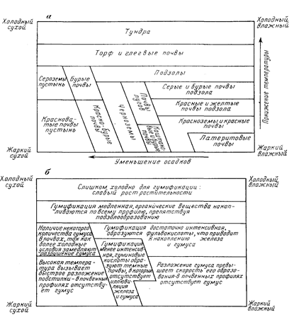 Рис. 2. Воздействие климата на почвенную зональность (а) и роль органического материала в образовании почв в соотношении с климатом (б). Границы а и б совпадают.