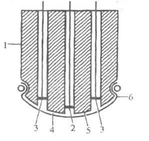 Например, в кислородном амперометрическом сенсоре (рис. 1) внутри цилиндрического корпуса 1 расположены индикаторный электрод 2 из платины и анод 3 из хлорида серебра (он же электрод сравнения). Электролит (водный раствор КС1) заливается в резервуар 4 и образует пленку 5 толщиной около 10 мкм. Полимерная мембрана 6 (полиэтилен, полипропилен, фторопласт, целлофан и др.) отделяет электролит от анализируемой среды (вода, газ), из которой кислород диффундирует через мембрану внутрь элемента и восстанавливается на катодно-поляризованном индикаторном электроде (реакция О2 + 4е- + 4Н+ = 2H2O). Ток восстановления определяется скоростью диффузии О2 сквозь мембрану. Скорость, в свою очередь, зависит от толщины и проницаемости мембраны. Катодная поляризация индикаторного электрода осуществляется как от постороннего источника тока, так и с помощью растворимого анода (гальванические сенсоры). Информативным параметром является предельный диффузионный ток при постоянном потенциале индикаторного электрода. Такие электрохимические сенсоры имеют, как правило, линейную зависимость электрического сигнала от парциального давления О2 (или др. электроактивного газа), что обеспечивает более высокую точность определения по сравнению, например, с потенциометрическим электрохимическим сенсором, в котором информативный параметр - равновесный (или квазиравновесный) электродный потенциал - имеет логарифмическую зависимость от содержания газа. Селективность электрохимических сенсоров определяется выбором подходящего материала электрода и рабочей области потенциалов. При анализе смеси газов необходимо, чтобы электрохимические реакции посторонних компонентов либо не имели места на данном электроде, либо протекали в области более высоких потенциалов.