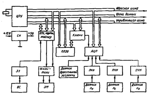 На рисунке 1, приведена структурная схема системы автоматического управления переключением передач, основанная на применении микросхем, входящих в состав микропроцессорного комплекта серии КР580.На вход системы подаются сигналы от датчиков скорости автомобиля и частоты вращения коленчатого вала двигателя, температуры двигателя, загрузки автомобиля и др., а также команды, поступающие от аппаратуры управления, на которые воздействует водитель (например, датчик положения педали управления подачей топлива, контроллер управления, запросы на индикацию состояния тех или иных устройств управления или показателей двигателя и коробки передач).