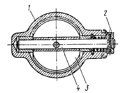 В приемных трубах глушителя установлены корпус 1 и заслонка 3, закрепленная на валу 4. На валу заслонки закреплен также поворотный рычаг 2, соединенный со штоком пневмоцилиндра. Рычаг 2 и связанная с ним заслонка 3 имеют два положения. Внутренняя полость корпуса сферическая. При выключении вспомогательной тормозной системы заслонка 3 устанавливается вдоль потока отработавших газов, а при включении – перпендикулярно потоку, создавая определенное противодавление в выпускных коллекторах. Одновременно прекращается подача топлива. Двигатель начинает работать в режиме компрессора [6].