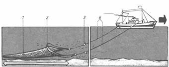 Лов рыбы при помощи донных тралов осуществляется с борта или с кормы судна. У траулеров бортового траления на главной палубе перед мостиком стоит траловая лебедка. От ее канатных барабанов ваеры проходят мимо люков рыбных трюмов к расположенным около фок-мачты центральным роульсам (блокам с перпендикулярной осью вращения); при этом через направляющие роульсы ваер левого борта подводится к носовой траловой дуге, а ваер правого борта — к кормовой. Оба ваера выводятся затем за борт через подвесные вращающиеся блоки траловых дуг. Носовая траловая дуга находится в нос от фок-мачты на расстоянии около 2 м от нее; расстояние между обеими траловыми дугами составляет 25—30 м. Верхняя часть траловой дуги расположена на высоте 3 м от палубы. Закрепленные на палубе траловые дуги дополнительно подкрепляются распорками из круглой стали, причем распорки проходят от верхней части траловой дуги к мачте или к надстройке.