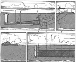 Добывающе-перерабатывающие суда имеют длину 60—90 м, две сплошные палубы и длинную надстройку. Мощность энергетической установки составляет примерно 1470 кВт, скорость свободного хода 12—14 уз, а скорость траления примерно 4 уз. Машинное отделение и отделение вспомогательных механизмов находятся в средней части судна, а в носу - отделение холодильных машин. Два-три изолированных рефрижераторных трюма расположены в носовой части судна между настилом второго дна и нижней палубой. Рыба из сетей ссыпается в бункер в подпалубном помещении, сортируется и перерабатывается. Обработка рыбы, например отделение голов, извлечение внутренностей, мытье и приготовление филе производится с помощью машин. Вручную обрабатывается только очень крупная рыба или рыба, для которой на борту нет соответствующих машин. Рыбное филе и мелкая чистая рыба укладывается на морозильные поддоны и консервируется глубоким замораживанием (до —30°С) в морозильных камерах. После короткого поверхностного оттаивания замороженную рыбу вынимают из поддонов и, чтобы предотвратить высыхание, глазируют пресной водой. По транспортерам филе, предварительно упакованное в коробки, подается в трюмы с низкой температурой (около —20°С). Головы, внутренности и прочие отходы, а также прилов по шнековому транспортеру подаются к мукомольной установке и там перерабатываются в муку. Рыбья печень после очистки, промывки, сушки и размельчения в мясорубке либо упаковывается в консервные банки и консервируется, либо в варильных установках перерабатывается в рыбий жир. Обычно добывающе-перерабатывающие суда оборудуют также установками для изготовления рыбных консервов. Рыба, пойманная под конец лова, доставляется на сушу обычно в свежем виде во льду. >Все транспортировочные процессы, включая хранение и разгрузку, механизированы, поэтому выполнение их проще, чем хранение и разгрузка свежей рыбы в слоях льда. трал 5.0