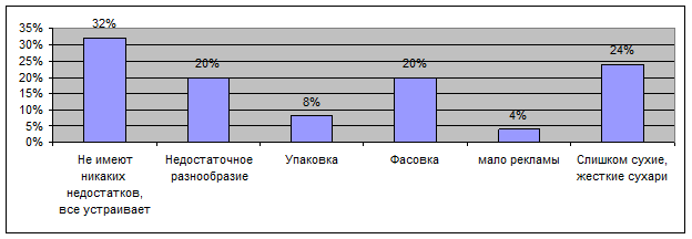 показал следующее: 8 человек считают, что сухари не имеют недостатков, это большинство опрошенных и составляет 32%, на втором месте вариант ответа – слишком сухие, жесткие сухари выбрали 6 человек (24%). Третье место разделили два варианта: недостаточное разнообразие, фасовка, каждый по 5 человек (20 %), на четвертом месте упаковка – 2 человека, 8%. На пятом месте свой вариант одного из респондентов – мало рекламы, никто не знает о сухарях за пределами города (4%). См. рис.1.