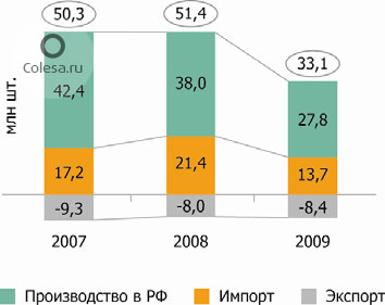 За 2009 год шинными предприятиями в РФ, включая локализованных иностранных производителей, было произведено около 27,8 млн. шин на сумму 74,1 млрд. рублей. Сокращение производства по сравнению с 2008 годом составило 27%. Экспорт шин из РФ по итогам 2009 года составил более 8,4 млн. штук. При этом объем экспорта даже вырос по отношению к 2008 году (на 6%), в котором из России было поставлено иностранным потребителям около 8 млн. штук шин. За 12 месяцев 2009 года в Россию было импортировано 13,7 млн. штук шин. По сравнению с 2008 годом, когда объем импорта шин в РФ составил 21,4 млн. штук, импортные поставки снизились на 36%.