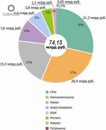Во многом за счет высокой доли в объеме выпуска относительно дорогой брендированной продукции лидером по производству стала «СИБУР – Русские шины», с 30% в общем объеме производства (в денежном выражении). На второй позиции – Нижнекамскшина, с долей в 27% от общего объема производства. Заметно выросла доля Nokian - 21%. Ослабли позиции компании Амтел - в 2009 году доля компании в объеме выпуска не превысила 10%. Алтайский шинный комбинат занял 6%,