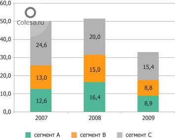 В разрезе ценовых рыночных сегментов также произошли изменения: в ушедшем году потребитель склонен был отказываться от дорогих и качественных шин в пользу более дешевых вариантов. В итоге, если в сегментах А и В емкость рынка сократилась на 46% и 41% соответственно, то в сегменте С снижение не превысило 27%.