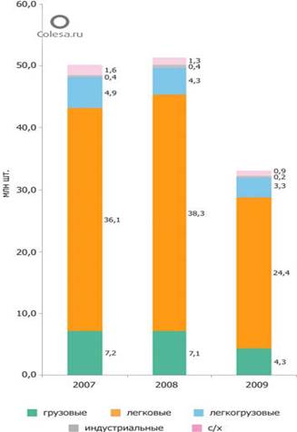По результатам 2009 года рынок автомобильных шин всех видов (включая колесную технику индустриального назначения, а также трактора и комбайны на колесном ходу) составил в России около 33 млн. штук, что почти на 36% меньше, чем годом ранее (2008 год – 51,4 млн. штук). Для сравнения, в последний докризисный 2007 год емкость российского шинного рынка была равна 50,2 млн. штук, а на протяжении всего 2007 и первых трех кварталов 2008 года рынок демонстрировал очень высокие темпы роста. В стоимостном выражении рынок в 2009 году сократился на 40% - до 95,14 млрд. рублей (2008 год - 157,7 млрд. рублей). Основными причинами сокращения емкости шинного рынка являются факторы, напрямую связанные с общеэкономическим кризисом: дефицит свободных денежных средств у потребителя, снижение общей автотранспортной активности, падение объемов производства автомобилей в РФ.