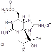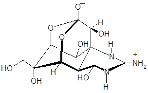 Структура його остаточно встановлена рентгеноструктурним аналізом в 1975р. незалежно групами Е.Шанца і Г.Рапопорта(США). Пізніше сакситоксин був виявленим також у прісноводних синьо-зелених водоростях Aphanizomenon flos-aquae, а його аналоги — неосакситоксин, сульфовані похідні гонітоксини , та інш. — в ряді морських мікроводоростях, що головним чином зустрічаються у Північній Атлантиці, північній частині Тихого океану і на берегах Японії. Сакситоксин представляє собою дигуанідинове похідне з жорстким трициклічним скелетом, уретановою функцією і гідратованою 12-карбонільною групою в піролідиновому кільці і нагадує тетродотоксин.