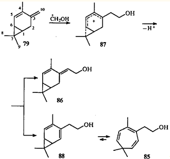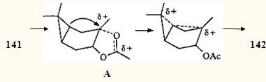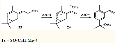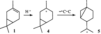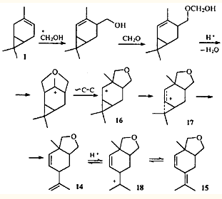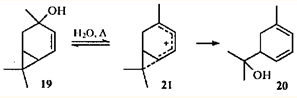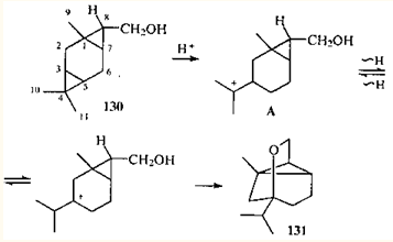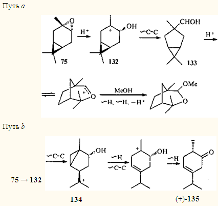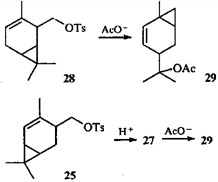В данном случае перегруппировка Вагнера-Меервейна, протекающая как алкильный сдвиг, не приводит к изменению карановой структуры. Однако алкильный сдвиг возможен лишь потому, что в образующемся вторичном ионе 16
