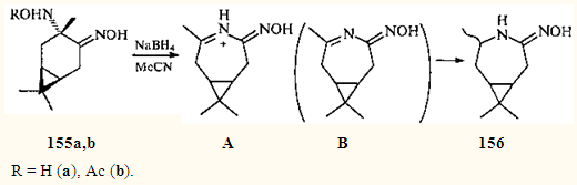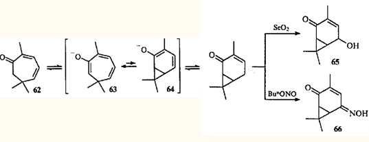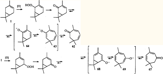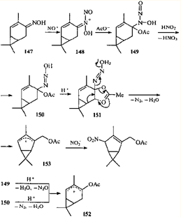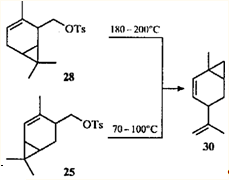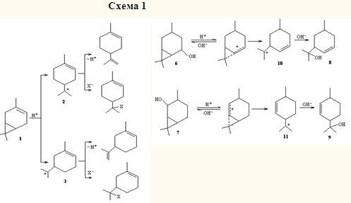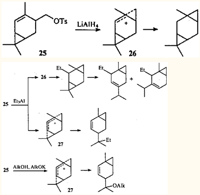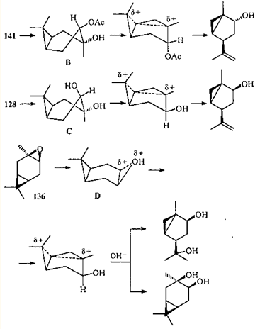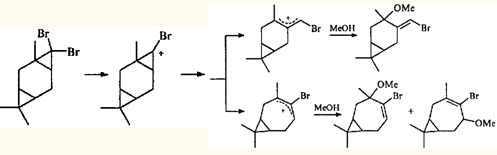 Реализация ионного механизма при молекулярных перегруппировках карановых монотерпеноидов обусловлена взаимодействием циклопропанового кольца с электронодефицитным карбениевым центром в α- или β-положении к циклу. Интерес к этому типу перегруппировок связан с возможностью образования интермедиатов с делокализованным зарядом. Согласно предложенной в обзоре10