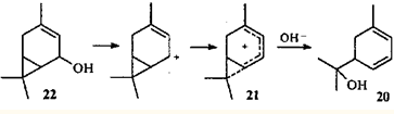 Очевидно, что в систему ЦПК - заряженный атом углерода может включаться одна или несколько двойных связей. Образующийся при этом гомопентадиенильный ион характеризуется большей степенью делокализации заряда, чем гомоаллильный, и имеет, соответственно, более низкую энергию. Поэтому реакции с участием гомопентадиенильных ионов протекают легче, чем с участием гомоаллильных. Изомеризация 4-карен-3-ола (19