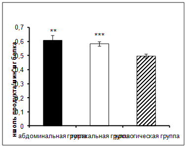 2. Обнаружено увеличение активности ангиотензинпревращающего фермента у урологической группы пациентов по сравнению с абдоминальной и торакальной группами онкологических больных в раннем послеоперационном периоде.