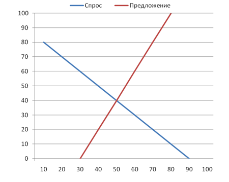 Ответ: При цене масла 50 руб./кг спрос будет равен предложению и будет составлять 40 тыс. тонн. Точка равновесия имеет координаты (50;40).