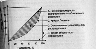 Для графического изображения степени неравномерности распределении доходов строится кривая Лоренца (рис. 3.5.1).