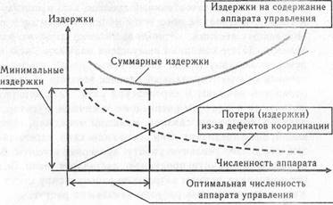 Получается, что численность аппарата, с одной стороны, должна быть минимальной, а с другой - достаточно большой (недостаток менеджеров не должен стать причиной сбоев в производстве и реализации продукции). Как же найти компромисс между этими двумя противоположными требованиями к численности аппарата управления? Ответ может быть найден из графика.
